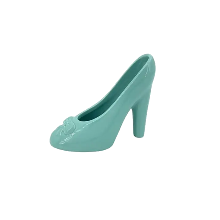 Scarpetta decorativa in ceramica a forma di scarpetta con un fiocchetto sulla punta.
