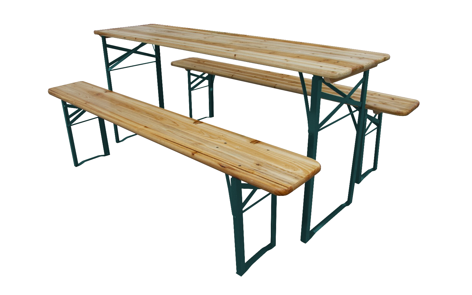Struttura sottostante in metallo con pianali in legno, composta da un tavolo e due panche e piedi pieghevoli